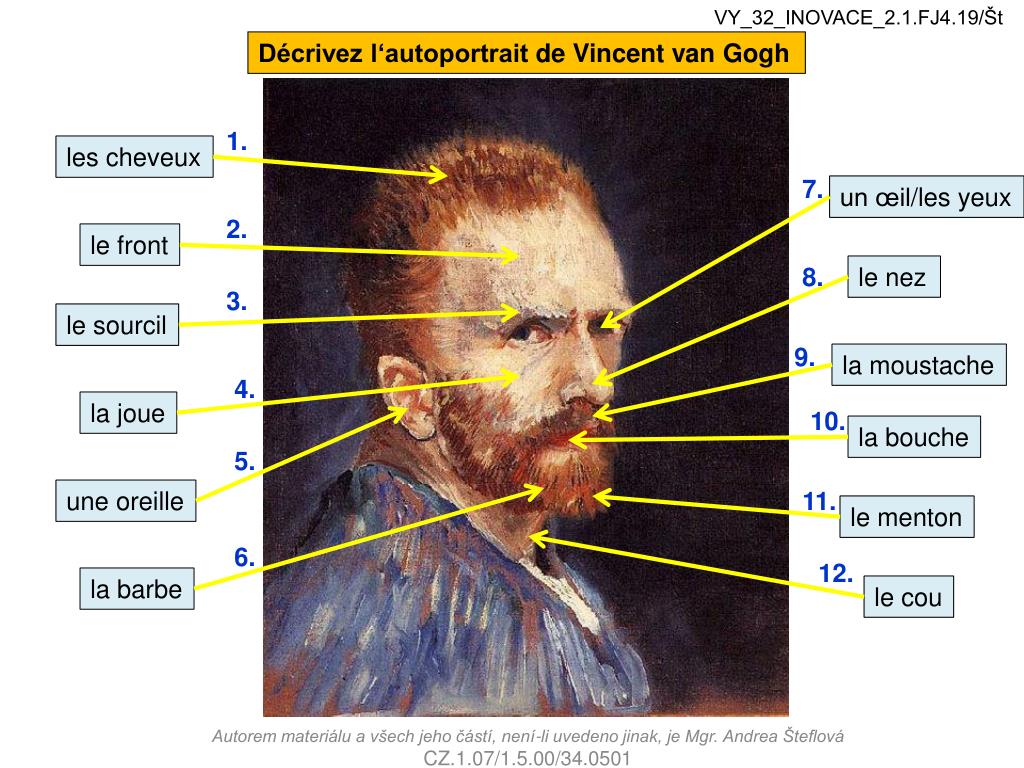 VY_32_INOVACE_2.1.FJ4.19/Št Décrivez l‘autoportrait de Vincent van Gogh 1. les cheveux 7. un œil/les yeux 2. le front 8. le nez 3. le sourcil 9. la moustache 4. la joue 10. la bouche 5. une oreille 11. le menton 6. 12. la barbe le cou Autorem materiálu a všech jeho částí, není-li uvedeno jinak, je Mgr. Andrea Šteflová CZ.1.07/1.5.00/34.0501
