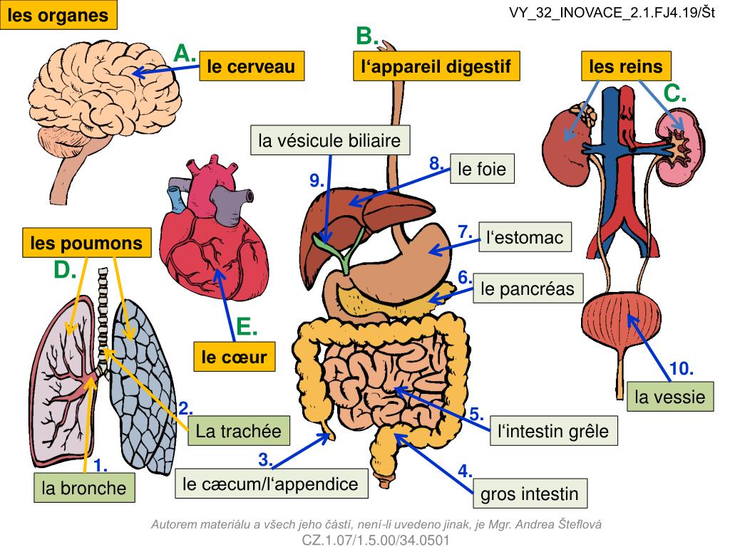 les organes VY_32_INOVACE_2.1.FJ4.19/Št B. A. le cerveau l‘appareil digestif les reins C. la vésicule biliaire 8. le foie 9. 7. l‘estomac les poumons D. 6. le pancréas E. le cœur 10. la vessie 2. 5. La trachée l‘intestin grêle 3. 1. 4. le cæcum/l‘appendice la bronche gros intestin Autorem materiálu a všech jeho částí, není-li uvedeno jinak, je Mgr. Andrea Šteflová CZ.1.07/1.5.00/34.0501