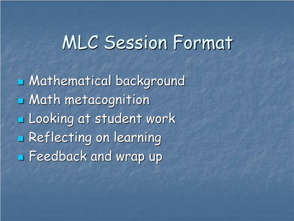 MLC Session Format Mathematical background Math metacognition Looking at student work Reflecting on learning Feedback and wrap up