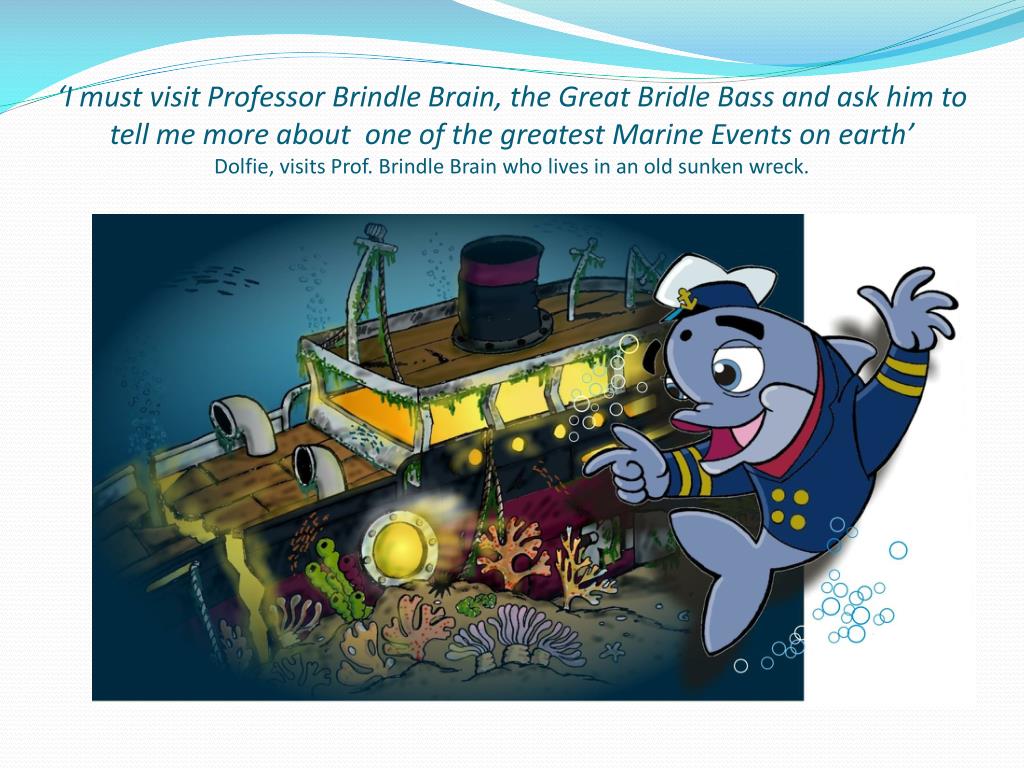 ‘I must visit Professor Brindle Brain, the Great Bridle Bass and ask him to tell me more about one of the greatest Marine Events on earth’Dolfie, visits Prof. Brindle Brain who lives in an old sunken wreck.