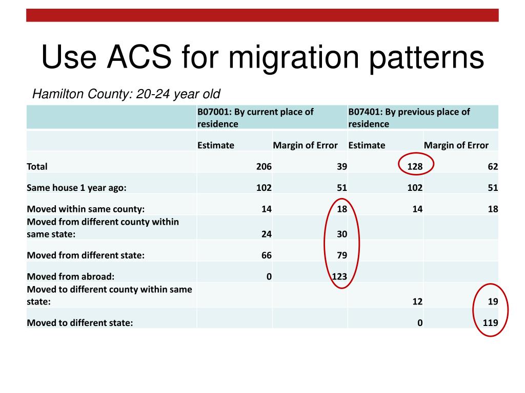 Use ACS for migration patterns Hamilton County: 20-24 year old