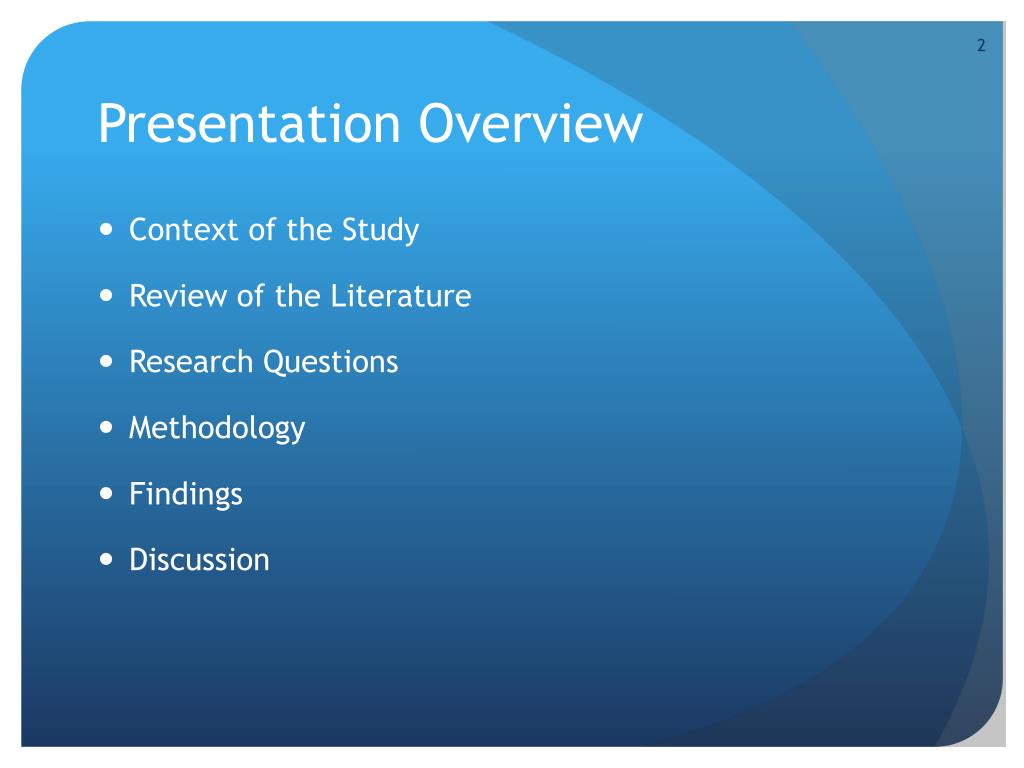Presentation Overview • Context of the Study • Review of the Literature • Research Questions • Methodology • Findings • Discussion