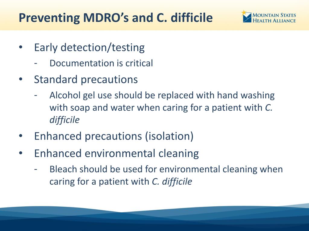 Preventing MDRO’s and C. difficile • Early detection/testing • Documentation is critical • Standard precautions • Alcohol gel use should be replaced with hand washing with soap and water when caring for a patient with C.difficile • Enhanced precautions (isolation) • Enhanced environmental cleaning • Bleach should be used for environmental cleaning when caring for a patient with C. difficile
