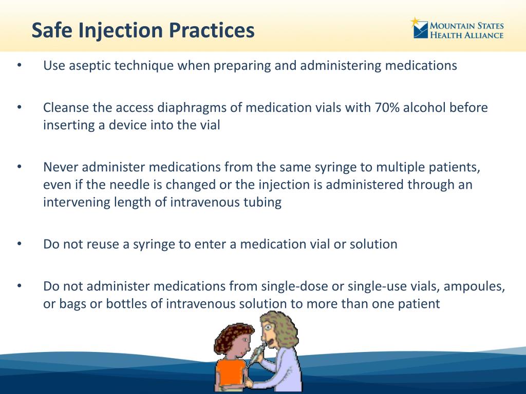 Safe Injection Practices • Use aseptic technique when preparing and administering medications • Cleanse the access diaphragms of medication vials with 70% alcohol before inserting a device into the vial • Never administer medications from the same syringe to multiple patients, even if the needle is changed or the injection is administered through an intervening length of intravenous tubing • Do not reuse a syringe to enter a medication vial or solution • Do not administer medications from single-dose or single-use vials, ampoules, or bags or bottles of intravenous solution to more than one patient