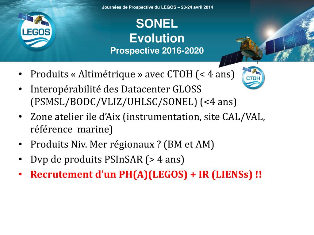 Journées de Prospective du LEGOS – 23-24 avril 2014 SONEL Evolution Prospective 2016-2020 • Produits « Altimétrique » avec CTOH (< 4 ans) • Interopérabilité des Datacenter GLOSS (PSMSL/BODC/VLIZ/UHLSC/SONEL) (<4 ans) • Zone atelier ile d’Aix (instrumentation, site CAL/VAL, référence marine) • Produits Niv. Mer régionaux ? (BM et AM) • Dvp de produits PSInSAR (> 4 ans) • Recrutement d’un PH(A)(LEGOS) + IR (LIENSs) !!
