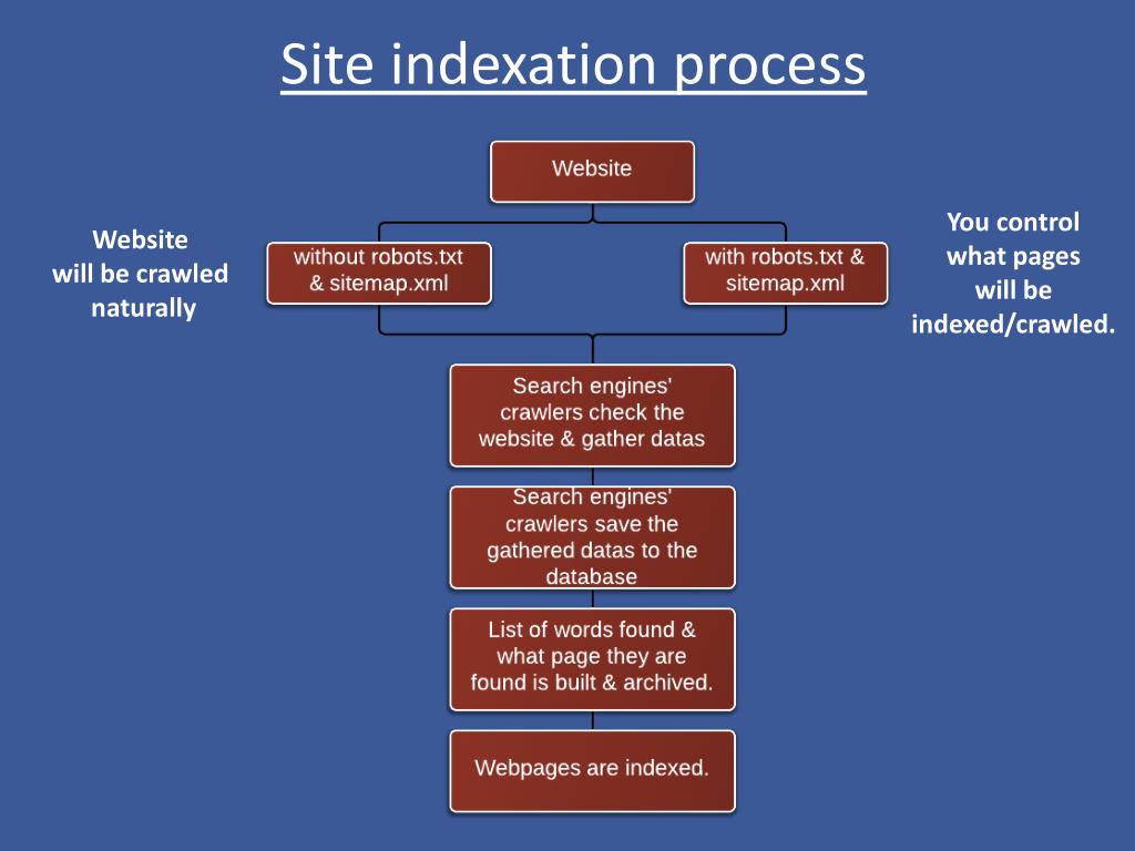 Site indexation process You control what pages will be indexed/crawled. Website will be crawled naturally