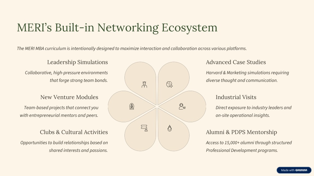 4. MERI’s Built-in Networking Ecosystem The MERI MBA curriculum is intentionally designed to maximize interaction and collaboration across various platforms. Leadership Simulations Advanced Case Studies Collaborative, high-pressure environments that forge strong team bonds. Harvard & Marketing simulations requiring diverse thought and communication. New Venture Modules Industrial Visits Team-based projects that connect you with entrepreneurial mentors and peers. Direct exposure to industry leaders and on-site operational insights. Clubs & Cultural Activities Alumni & PDPS Mentorship Opportunities to build relationships based on shared interests and passions. Access to 15,000+ alumni through structured Professional Development programs.