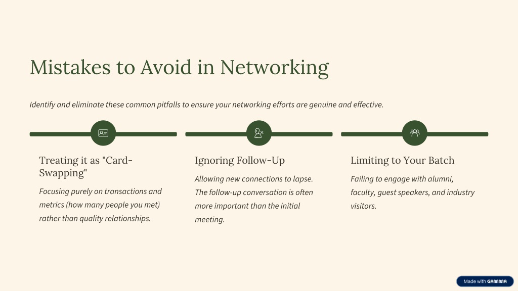 7. Mistakes to Avoid in Networking Identify and eliminate these common pitfalls to ensure your networking efforts are genuine and effective. Treating it as "Card-Swapping" Ignoring Follow-Up Limiting to Your Batch Allowing new connections to lapse. The follow-up conversation is often more important than the initial meeting. Failing to engage with alumni, faculty, guest speakers, and industry visitors. Focusing purely on transactions and metrics (how many people you met) rather than quality relationships.