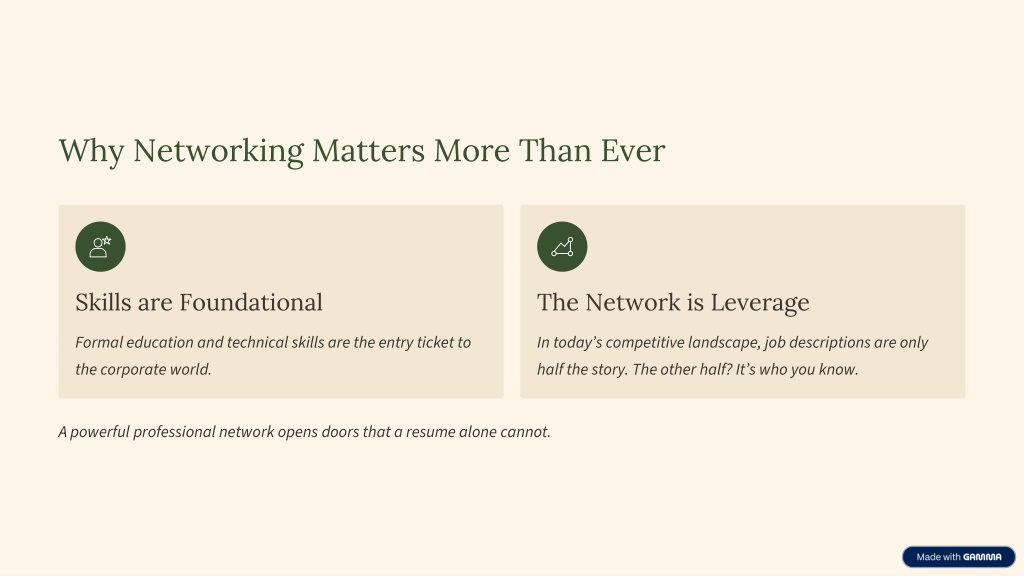 2. Why Networking Matters More Than Ever Skills are Foundational The Network is Leverage Formal education and technical skills are the entry ticket to the corporate world. In today’s competitive landscape, job descriptions are only half the story. The other half? It’s who you know. A powerful professional network opens doors that a resume alone cannot.