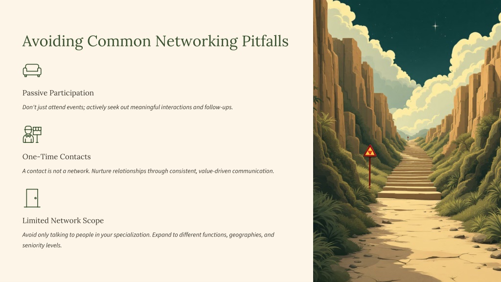 8. Avoiding Common Networking Pitfalls Passive Participation Don't just attend events; actively seek out meaningful interactions and follow-ups. One-Time Contacts A contact is not a network. Nurture relationships through consistent, value-driven communication. Limited Network Scope Avoid only talking to people in your specialization. Expand to different functions, geographies, and seniority levels.