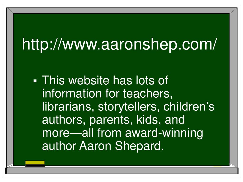 http://www.aaronshep.com/ • This website has lots of information for teachers, librarians, storytellers, children’s authors, parents, kids, and more—all from award-winning author Aaron Shepard.