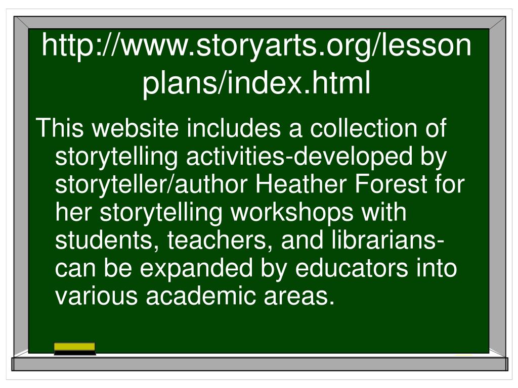http://www.storyarts.org/lessonplans/index.html This website includes a collection of storytelling activities-developed by storyteller/author Heather Forest for her storytelling workshops with students, teachers, and librarians-can be expanded by educators into various academic areas.