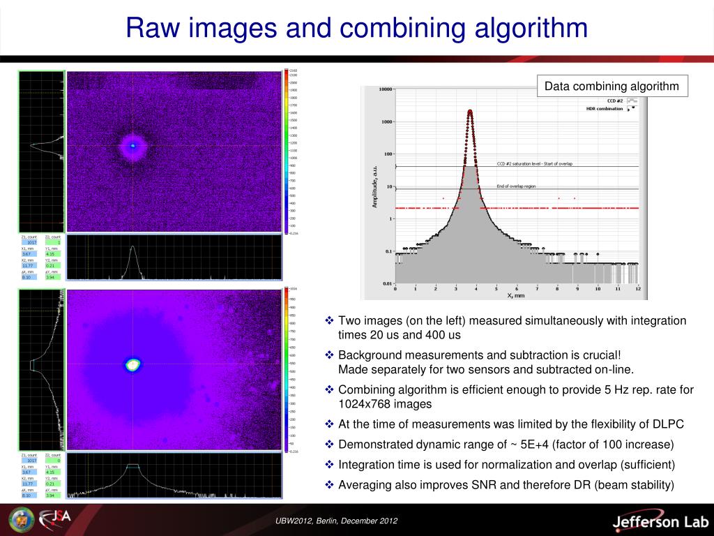 Raw images and combining algorithm • Two images (on the left) measured simultaneously with integration times 20 us and 400 us • Background measurements and subtraction is crucial!Made separately for two sensors and subtracted on-line. • Combining algorithm is efficient enough to provide 5 Hz rep. rate for 1024x768 images • At the time of measurements was limited by the flexibility of DLPC • Demonstrated dynamic range of ~ 5E+4 (factor of 100 increase) • Integration time is used for normalization and overlap (sufficient) • Averaging also improves SNR and therefore DR (beam stability) Data combining algorithm