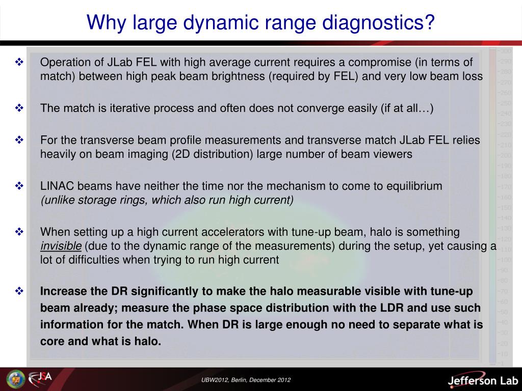 Why large dynamic range diagnostics? • Operation of JLab FEL with high average current requires a compromise (in terms of match) between high peak beam brightness (required by FEL) and very low beam loss • The match is iterative process and often does not converge easily (if at all…) • For the transverse beam profile measurements and transverse match JLab FEL relies heavily on beam imaging (2D distribution) large number of beam viewers • LINAC beams have neither the time nor the mechanism to come to equilibrium(unlike storage rings, which also run high current) • When setting up a high current accelerators with tune-up beam, halo is something invisible (due to the dynamic range of the measurements) during the setup, yet causing a lot of difficulties when trying to run high current • Increase the DR significantly to make the halo measurable visible with tune-up beam already; measure the phase space distribution with the LDR and use such information for the match. When DR is large enough no need to separate what is core and what is halo.