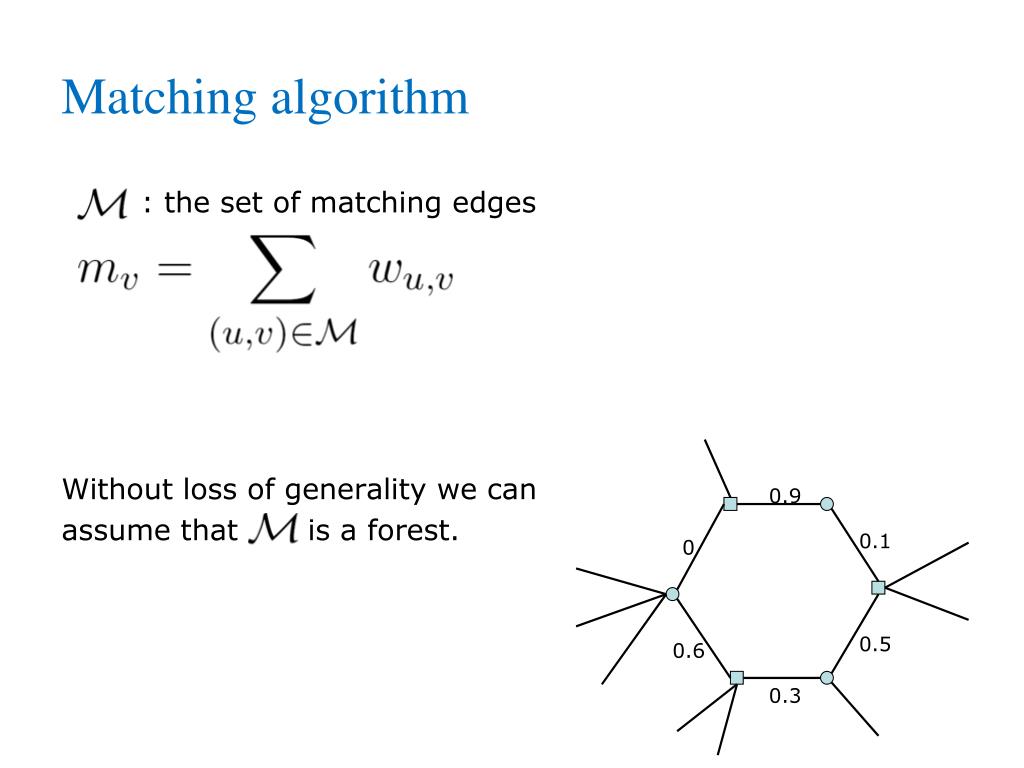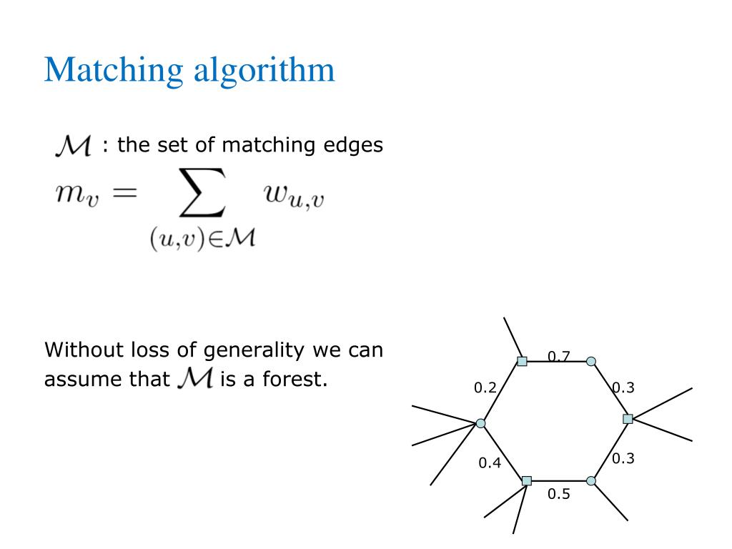 Matching algorithm : the set of matching edges Without loss of generality we can assume that is a forest. 0.7 0.2 0.3 0.3 0.4 0.5