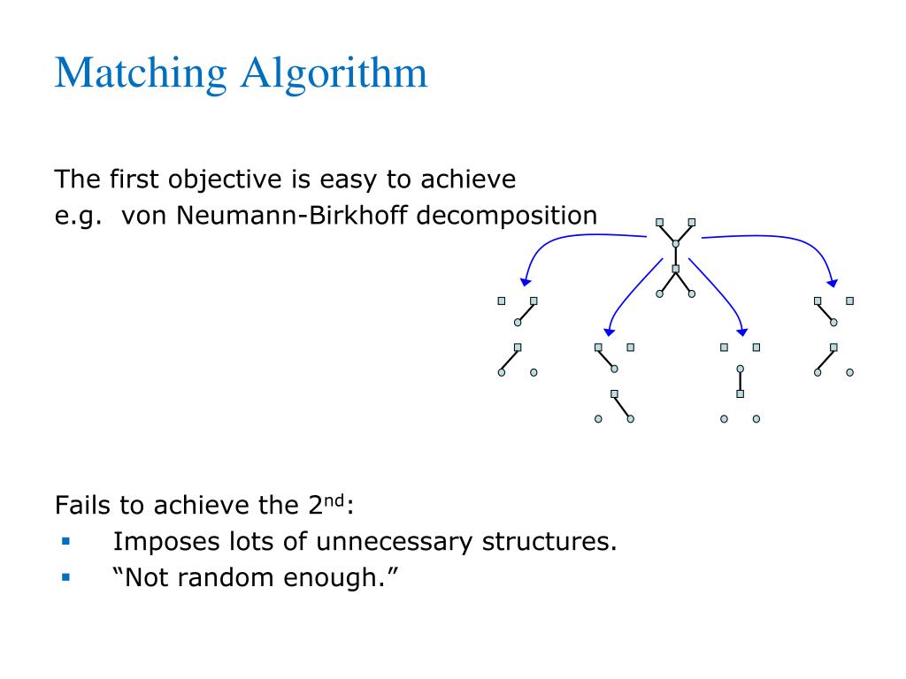 Matching Algorithm The first objective is easy to achieve e.g. von Neumann-Birkhoff decomposition Fails to achieve the 2nd: • Imposes lots of unnecessary structures. • “Not random enough.”