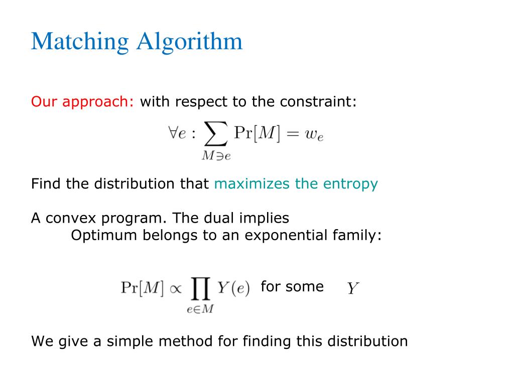 Matching Algorithm Our approach: with respect to the constraint: Find the distribution that maximizes the entropy A convex program. The dual implies Optimum belongs to an exponential family: for some We give a simple method for finding this distribution
