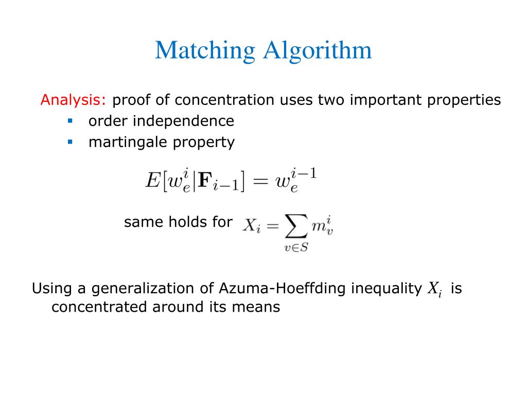 Matching Algorithm Analysis: proof of concentration uses two important properties • order independence • martingale property same holds for Using a generalization of Azuma-HoeffdinginequalityXiis concentrated around its means