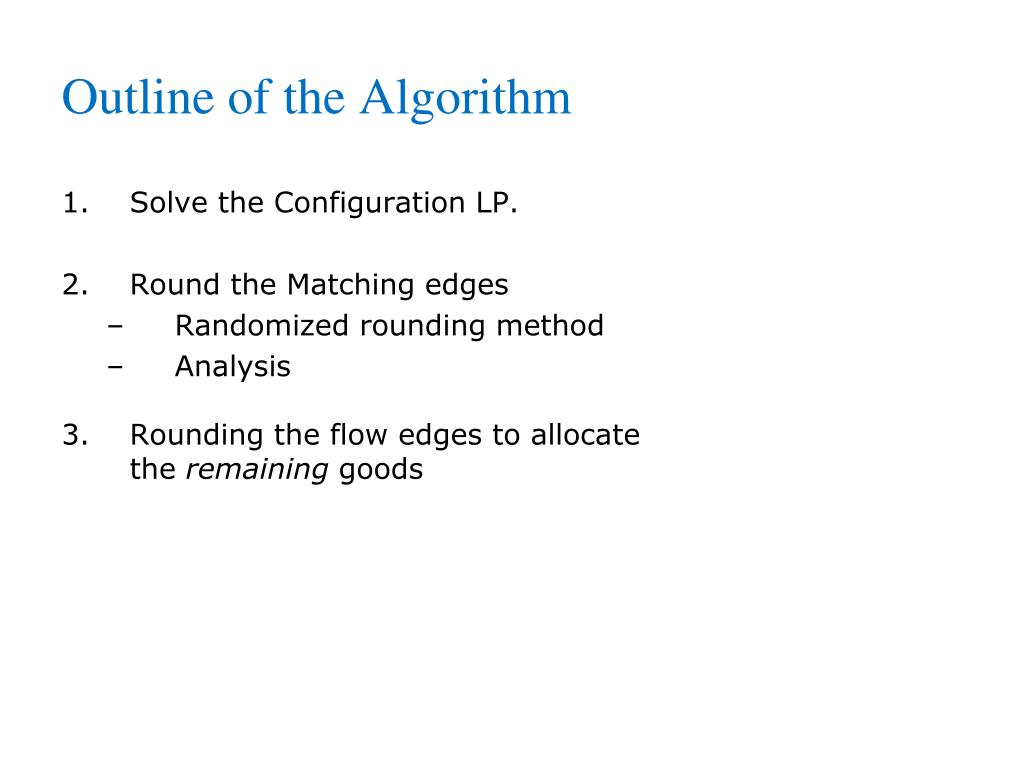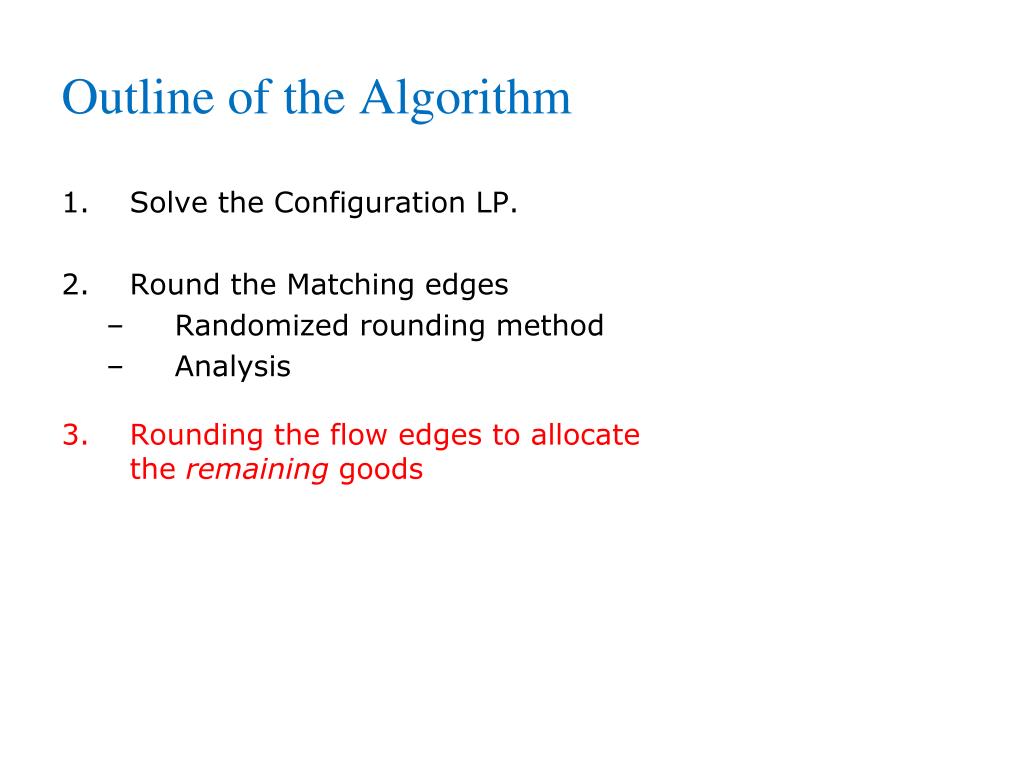 Outline of the Algorithm • Solve the Configuration LP. • Round the Matching edges • Randomized rounding method • Analysis • Rounding the flow edges to allocate the remaining goods