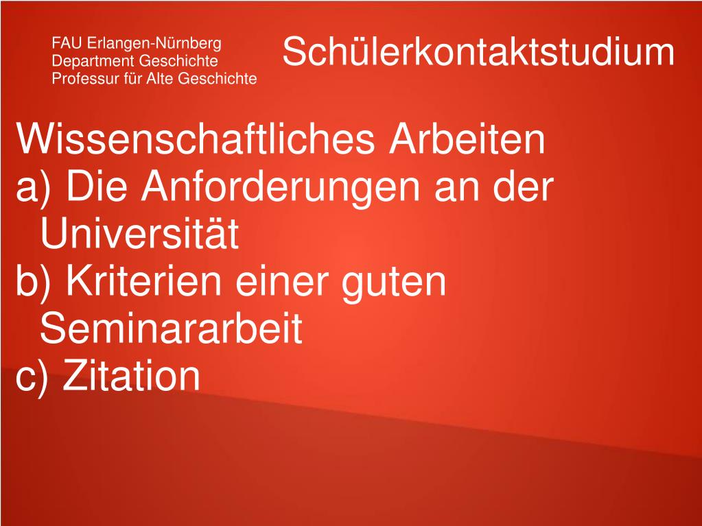 Wissenschaftliches Arbeiten a) Die Anforderungen an der Universität b) Kriterien einer guten Seminararbeit c) Zitation Schülerkontaktstudium FAU Erlangen-Nürnberg Department Geschichte Professur für Alte Geschichte