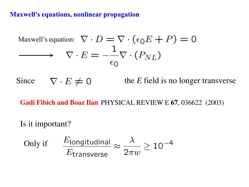 the E field is no longer transverse Since Gadi Fibich and Boaz Ilan PHYSICAL REVIEW E 67, 036622 (2003) Only if Maxwell’s equations, nonlinear propagation Maxwell’s equation: Is it important?