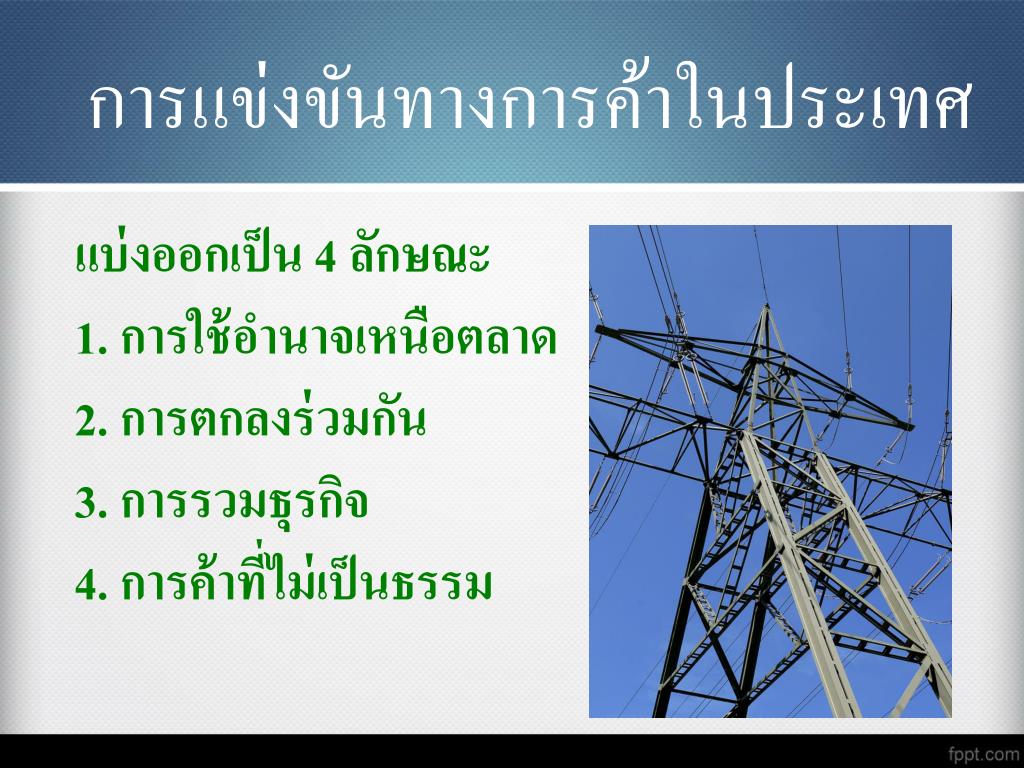 การแข่งขันทางการค้าในประเทศการแข่งขันทางการค้าในประเทศ แบ่งออกเป็น 4 ลักษณะ 1. การใช้อำนาจเหนือตลาด 2. การตกลงร่วมกัน 3. การรวมธุรกิจ 4. การค้าที่ไม่เป็นธรรม