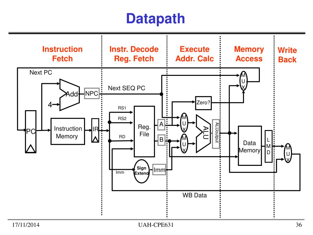 Datapath Instruction Fetch Instr. Decode Reg. Fetch Execute Addr. Calc Memory Access Write Back Next PC M U X Next SEQ PC Add NPC Zero? 4 RS1 M U X InstructionMemory RS2 A Reg. File IR PC ALU ALUoutput RD M U X B LMD DataMemory M U X Sign Extend Imm Imm WB Data UAH-CPE631