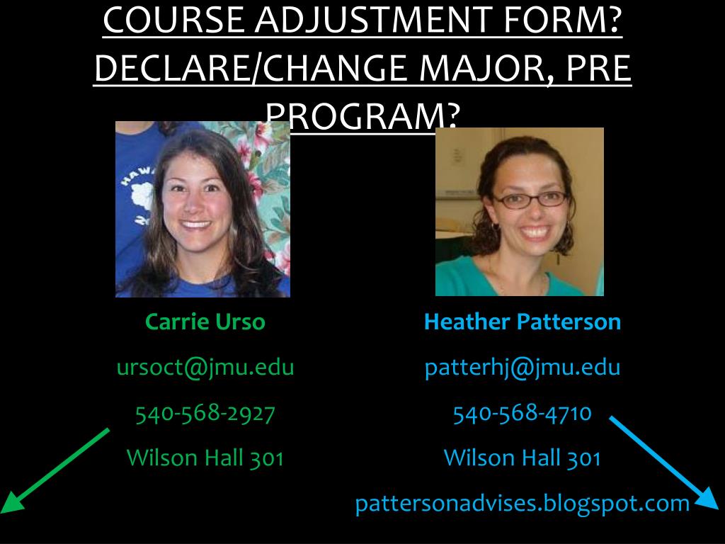 COURSE ADJUSTMENT FORM?DECLARE/CHANGE MAJOR, PRE PROGRAM? Carrie Urso ursoct@jmu.edu 540-568-2927 Wilson Hall 301 Heather Patterson patterhj@jmu.edu 540-568-4710 Wilson Hall 301 pattersonadvises.blogspot.com