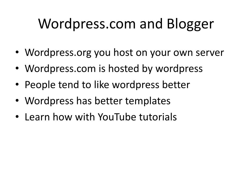Wordpress.com and Blogger • Wordpress.org you host on your own server • Wordpress.com is hosted by wordpress • People tend to like wordpress better • Wordpress has better templates • Learn how with YouTube tutorials