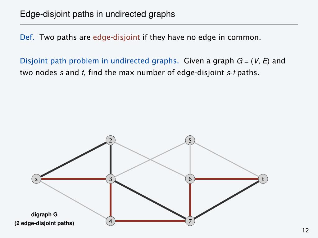 Edge-disjoint paths in undirected graphs 6 3 s t 5 2 7 4 • Def. Two paths are edge-disjoint if they have no edge in common. • Disjoint path problem in undirected graphs. Given a graph G = (V, E) and two nodes s and t, find the max number of edge-disjoint s-t paths. digraph G