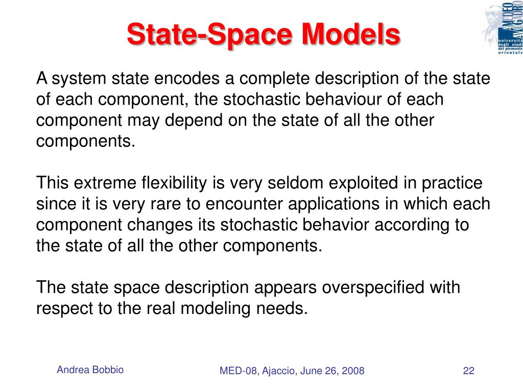 State-Space Models A system state encodes a complete description of the state of each component, the stochastic behaviour of each component may depend on the state of all the other components. This extreme flexibility is very seldom exploited in practice since it is very rare to encounter applications in which each component changes its stochastic behavior according to the state of all the other components. The state space description appears overspecified with respect to the real modeling needs. MED-08, Ajaccio, June 26, 2008