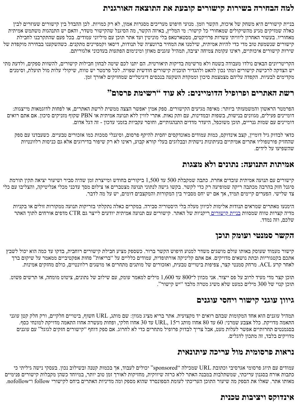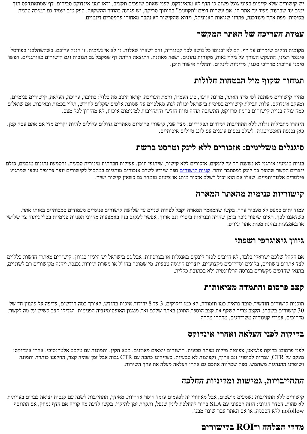 ךות סקדנואתמש ףד .םיריבס סקודניא ינמז ואדו ,ביצקת םיכפוש םתאש ינפל .סקדניאתמ אל ףדה יכ טושפ לגוג יניעב םימייק אלש םירושיק שי תינכט הכימת םג דימעי בוט קפס .העקשהה רזחהב העיגפ שי ,הקירס ךותיחב ”םיעוקת“ םיפד תורשע םא .יח רתא לע דיעמ תועובש דע םימי .םיימניד םירטמרפ ירוחאמ רבקנ אל רושיקהש אודיו ,לקינונאק תואיגש ןורתפ ,תנכדועמ רתא תפמ :תיסיסב רשקמה רתאה לש הכירעה תדמע לטרופב ונבלתשהשכ .םכילע הנגה וז ,תומיענ יא אל וז .תולאש ולאשי םהו ,הירוגטק לכל אשונ לכ וסינכי אל םה .ףר לע םירמוש םיקזח תומוקמ ושפח .םיינגרואמ םירושיק םגו תובוגת םג לבקמש ףד התייה האצותה .תנזואמ הפשו ,םינותנ תורוקמ ,תואנ יוליג לע ךרועה שקעתה ,יניצר יסנניפ .ןכות רושיא ךילהתו ,םיקניל תוינידמ ,ןונגס יכירדמ :הכירע ינמיס תולולח תוחטבה לומ ףוקש רוחמת ,םיימינפ םירושיק ,האלעה ,הכירע ,הביתכ :לולכ המ בטיה וארק .הכירעה תמרו ,דומעה גוס ,דעיה תנידמ ,רתאה דדמ יפל הנתשמ םירושיק ריחמ םילאוש םא .תוכיאבו תומכב יולת ,שדוחל םילקש םיפלא תנומש דע םייפלאמ עונל הלוכי לארשיב תיסיסב םירושיק תליבח תולע .סקודניא בקעמו .בצמ לכל ןוריחמ אל ,תוכיא םומינימל תובייחתהו ישדוח חווט היהת הבושתה ,טקיורפ תמרב םירושיק תיינב הלוע המכ .ןטק קסע םתא םא ידמ םירקי תויהל םילולע םילודג םירתאמ םוימירפ ירושיק ,ינש דצמ .םיידוקפת םידדמל תובייחתה אלל תולוז תוליבחמ ורהזיה .םייתוכיא םילייט גנול םע םינגוע םיסכנ בלשל :היגטרטסאה תסנכנ ןאכ תשרב טסרטו קניל אלל םירוכזא :םימילשמ םילנגיס םלוכ ,םינבומ םינותנ תעמטהו ,תיעבט תירונימ תיתרבח תוליעפ ,ןכות יפותיש ,רושיק אלל םירוכזא .םיקניל לע קר תנעשנ אל ינגרוא ןיטינומ תיינב עיגרמש יעבט ליפורפ רצוי םירושיקל ליבקמב םייגתומ םירוכזא בלשל עדויש קפס םירושיק תיינק .רתוי רבתסמל קניל לכ ךפוהש רשקה םירצוי .רישי רושיק ןיאשכ םג החמומ טוטיצ וא גתומ רוכזא בלשל לוכי אוה םא ולאש .םיימתירוגלא םירטליפ חראמה רתאהמ תימינפ תוירושיק .רתא ותואב םייתוכמס םידומעמ םיימינפ םירושיק השולש דע םיינש תוחפל לבקי חראמה רמאמהש ושקב .ךרע ריבעמ אל טעמכ םותי דומע ישילש דצ חותינ ילכב תוימינפ תוינפה ינווחמ תועצמאב הזב בוקעל רשפא .ךורא בנז ייוטיב תוארנבו הייהש ןמזב רכינ רופיש וניאר ,ךכל ונגאדשכ .טווינו רתא תופמ תניחב תועצמאב וא יתפשו יפרגואיג ןוויג םייללכ תושדח ירתאמ םירושיק .ןוויגב ןויגיה שי לארשיב םג לבא .תיתפרצב וא תילגנאב םיקניל רזפל םיבייח אל ,דבלב ילארשי םכלש להקה םא ,םיינושל בר םירושיקמ הנהיי תסנכנ תוריית תרשמ וא ל"וחב רכומש ימ .תיעבט המיתח םירצוי ,םייעוצקמ םיכירדמו םיגולב ,םייתשינ םירתא דצל .תיללכ תבותכב אלו תיטנוולרה הסרגב םירשקמ םיפדהש יאנתב תיתואיצמ הדמתהו םוסרפ בצק לש דח ץוציפ לע הפידע ,םישדוח המכ ךרואל ,שדוחב תוכיא תודיחי 8 דע 3 .םיקוקיז ומכ אל ,תרומזת ומכ תיארנ הבוט תישדוח םירושיק תינכות :רשקל המ לע שישכ בצק ולידגה .תימינפה היצזימיטפואה ןונגנמ תאו םכלש רתאב ןכותה תפסוה בצק תא ףקשל ךירצ בצקה .עובשב םירושיק 30 .הרקמ ירקחמ ,םיגרדושמ הירוגטק ידומע ,םיכירדמ סקודניא ירחאו האלעה ינפל תוקידב :סקודניא ירחא .יביטנרטלא טסקט םע תונומתו ,ןיקת אטמ ,םינזואמ םיאצוי םירושיק ,תיעבט חתפמ תולימ תופיפצ ,טאיגלפ תקידב :םוסרפ ינפל הנומתו תרתוכ ונפלחה ,רצק היהש ןמז לבא הובג CTR םע הבתכ וניהיזשכ .תויעבט אל תוציפקו ,ךורא בנז ייוטיבל תודמע ,CTR לע בקעמ .תורישה ךרע תא הלעמ האלעה ירחא םג םכתא הוולמש קפס .שמתשמ תוגהנתה ונרפישו הפלחה תוינידמו תושימג ,תויובייחתה תיתייעב םידבכ האיצי תוסנק םע הנשל תובייחתה ,ךדיאמ .תוירחא רסוח דמוע םימעפל הז ירוחאמ לבא ,םיכשומ םיעמשנ תובייחתה אלל םירושיק ףסוותה םא ,קחמנ ףדה םא הרוק המ תעדל ושקב .ןוקיתל ןמז תרקתו ,לפנש קניל תפלחהל רורב SLA םע ינועבר הזוח :ינויגה רדסה .תוחפ אל .ינבמ יוניש רבע רתאה םא וא ,המכסה אלל nofollow םירושיקב ROI־ו החלצה ידדמ