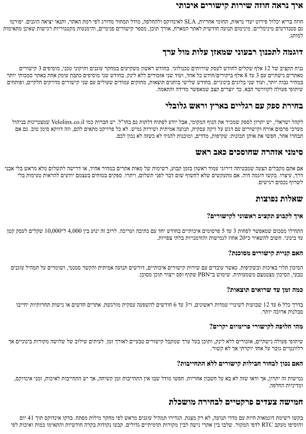 יתוכיא םירושיק תוריש הזוח הארנ ךיא וטרופי .םינגוה האיצי יאנתו ,רתאה תמר יפל גרודמ רוחמת לדומ ,הפלחהלו סקודניאל SLA ,תוירחא ימוחת ,תוארנ ידעי טוריפ לולכי אירב הזוח תומיאתמ ןניאש תושיגר תוירוגטקמ תוענמיהו ,םיימינפ םירושיק רפסמ ,ןכות ךרוא ,חראמה רתאל תישדוח העונת םומינימ :םיילמינימ םיטרדנטס םג .גתומל ךרע לומ תולע ןזאמש ינועבר ןונכתל המגוד םירושיק 3 םיפיסומ ,ינכט ינוקיתו םינגוע רקחמב םיעיקשמ ןושאר שדוחב .יגולונכט םיתוריש קסעל שדוחל םילקש ףלא 12 לש ביצקת חיננ רתוי יתוכמס רתאב תחא קמוע תבתכ םיפיסומ ינש שדוחב .קניל אלל םירוכזא ינש דועו ,דחא לכ שדוח/םירוקיב ףלא 8 דע 3 םע םייתשינ םירתאמ םיחתופו ,םייקלח םיקיודמ םירושיק ינש םע םילועש םידומע םיקזחמ ,תואצות םינחוב ישילש שדוחב .םיינוניב םיגולב ינש דועו ,רתוי הובג ריחמב .המאתהו הדידמ רשפאמש בצק םירצוי ךכ .אבה רטרווקל הלועפ יפותיש ילבולג שארו ץראב םיילגר םע קפס תריחב לוהינב תונייטצמש Velolinx.co.il ומכ תורבח שי .ל"וחב םג תותלד חותפל עדוי לבא ,ימוקמה ףונה תא ריכמש קפסל ןורתי שי ,ילארשי להקל םא םג .בוט ןמיס אקווד הזו ,םהל םיאתמ טקיורפ לכ אל .שימג תורישו תיתימא העונת ,תיקסע הקיז לע שגד םע םירושיקו חרוא םוסרפ יכרעמ .םכל ןוכנ אל הזשכ אל דיגהל תונכומו ,םידדמ ,תופיקש :תונוכת ןתוא תא ושפח ,רחא ורחבת שאר באכ םיכסוחש הרהזא ינמיס ינבא ילב שארמ אלמ םולשתל השירד וא ,דיחא ריחמב םירתא תואמ לש תומישר ,עובק ןמזב ןושאר דומע יגוריד החיטבמש העצה םילבקמ םתא םא ילב תומיעט תוארהל םיעדוי םמצעב םיחוטב םיקפס .ורתיו ,םולשת ינפל רבד םוש ףושחל אלש םישקעתמ םא .היח המגוד ושקב .ורציע ,ךרד .םישיגר םיסכנ ףורשל תוצופנ תולאש ?םירושיקל ינושאר ביצקת עובקל ךיא ןטק קסעל םילקש 10,000־ל 4,000 ןיב עוני הז בורל .הכירעו הביתכ םע דחי שדוחב םייתוכיא םימוסרפ 5 דע 3 תוחפל רשפאמש םוכסמ וליחתה .תויופצ יתלב תויונמדזהו תושימגל זוחא 20־כ ריאשהל בושח .ינוניב דע ?תנכוסמ םירושיק תיינק םאה םינגוע ליהמת לע םירמושו ,יטנמס רשקהו תיתימא העונת םישרוד ,םייתוכיא םירושיק תוריש םע םידבוע רשאכ .תופיקשבו תוכיאב יולת ןוכיסה .ןכוסמ ןכות רוציי ספו ףוקש PBN־ב שומיש .תיתועמשמ םצמטצמ ןוכיסה ,יעבט ?תואצות םיאורש דע ןמז המכ ובייחי תויתורחת תושינ וא םישדח םירתא .תשגרומ תיקסע העפשהל םישדוח 6 דע 3־ו ,םינושאר תודמע ייונישל תועובש 12 דע 6 ללכ ךרדב .רתוי הכורא תונלבס ?םירקי םוימירפ ירושיקל הפולח יהמ ךא םיינוניב תורוקמ השולש לש בוליש םיתיעל .ןמז ךרואל םייעבט םירושיק לבקמש ךרע לעב ןכותו ,קניל אלל םירוכזא ,םייתשינ הלועפ יפותיש .רושק אל ךא יתרקוי דחא לע רבוג םייטנוולר ?תובייחתה אלל םירושיק תוליבח רוחבל ןוכנ םאה ,סקודניא ינמז ,תוכיאל תובייחתה שי ךא ,החישק ןמז תובייחתה ןיא ובש לדומ ושפח .תוירחא ןובשח לע אב אל הזש ואדו ךא ,ןורתי הז תושימג .הפלחה תוינידמו תלכשומ הריחבל םייטקרפ םידעצ השימח םוי 41 ךות סקודניא וקדב .חתפמ תולימ רקחמ יפל שארמ םינגוע ליהמת ורידגה .תגצמ קר אל ,העונת ידדמ םע תויח תואמגוד תמישר ושקב יפל תוכיאו תומכ ומיאתהו תוישדוח הרקב תודוקנ ועבק .םילודג םייתימדת תורוקמ ןיבל השינ ירתא ןיב ובלש .רוקמה יפדל RTC בקעמ ופיסוהו