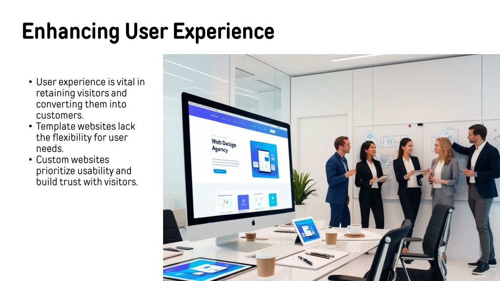 Enhancing User Experience • User experience is vital in retaining visitors and converting them into customers. • Template websites lack the flexibility for user needs. • Custom websites prioritize usability and build trust with visitors.