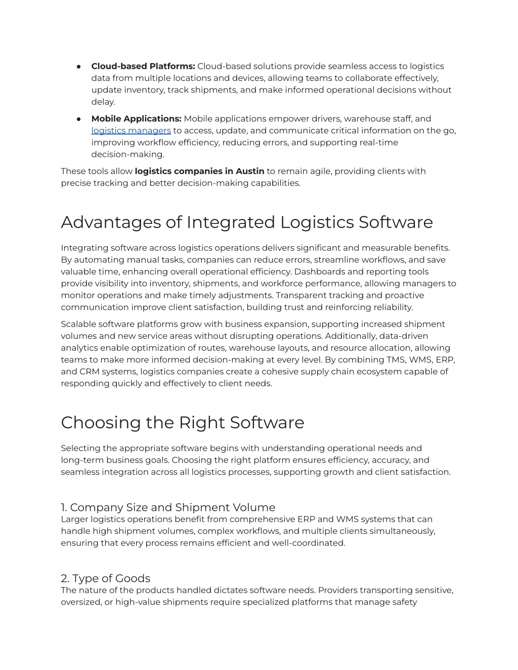 Cloud-based Platforms: Cloud-based solutions provide seamless access to logistics data from multiple locations and devices, allowing teams to collaborate effectively, update inventory, track shipments, and make informed operational decisions without delay. ● Mobile Applications: Mobile applications empower drivers, warehouse staff, and logistics managers to access, update, and communicate critical information on the go, improving workflow efficiency, reducing errors, and supporting real-time decision-making. ● These tools allow logistics companies in Austin to remain agile, providing clients with precise tracking and better decision-making capabilities. Advantages of Integrated Logistics Software Integrating software across logistics operations delivers significant and measurable benefits. By automating manual tasks, companies can reduce errors, streamline workflows, and save valuable time, enhancing overall operational efficiency. Dashboards and reporting tools provide visibility into inventory, shipments, and workforce performance, allowing managers to monitor operations and make timely adjustments. Transparent tracking and proactive communication improve client satisfaction, building trust and reinforcing reliability. Scalable software platforms grow with business expansion, supporting increased shipment volumes and new service areas without disrupting operations. Additionally, data-driven analytics enable optimization of routes, warehouse layouts, and resource allocation, allowing teams to make more informed decision-making at every level. By combining TMS, WMS, ERP, and CRM systems, logistics companies create a cohesive supply chain ecosystem capable of responding quickly and effectively to client needs. Choosing the Right Software Selecting the appropriate software begins with understanding operational needs and long-term business goals. Choosing the right platform ensures efficiency, accuracy, and seamless integration across all logistics processes, supporting growth and client satisfaction. 1. Company Size and Shipment Volume Larger logistics operations benefit from comprehensive ERP and WMS systems that can handle high shipment volumes, complex workflows, and multiple clients simultaneously, ensuring that every process remains efficient and well-coordinated. 2. Type of Goods The nature of the products handled dictates software needs. Providers transporting sensitive, oversized, or high-value shipments require specialized platforms that manage safety