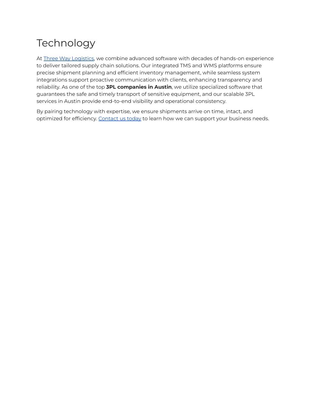 Technology At Three Way Logistics, we combine advanced software with decades of hands-on experience to deliver tailored supply chain solutions. Our integrated TMS and WMS platforms ensure precise shipment planning and efficient inventory management, while seamless system integrations support proactive communication with clients, enhancing transparency and reliability. As one of the top 3PL companies in Austin, we utilize specialized software that guarantees the safe and timely transport of sensitive equipment, and our scalable 3PL services in Austin provide end-to-end visibility and operational consistency. By pairing technology with expertise, we ensure shipments arrive on time, intact, and optimized for efficiency. Contact us today to learn how we can support your business needs.