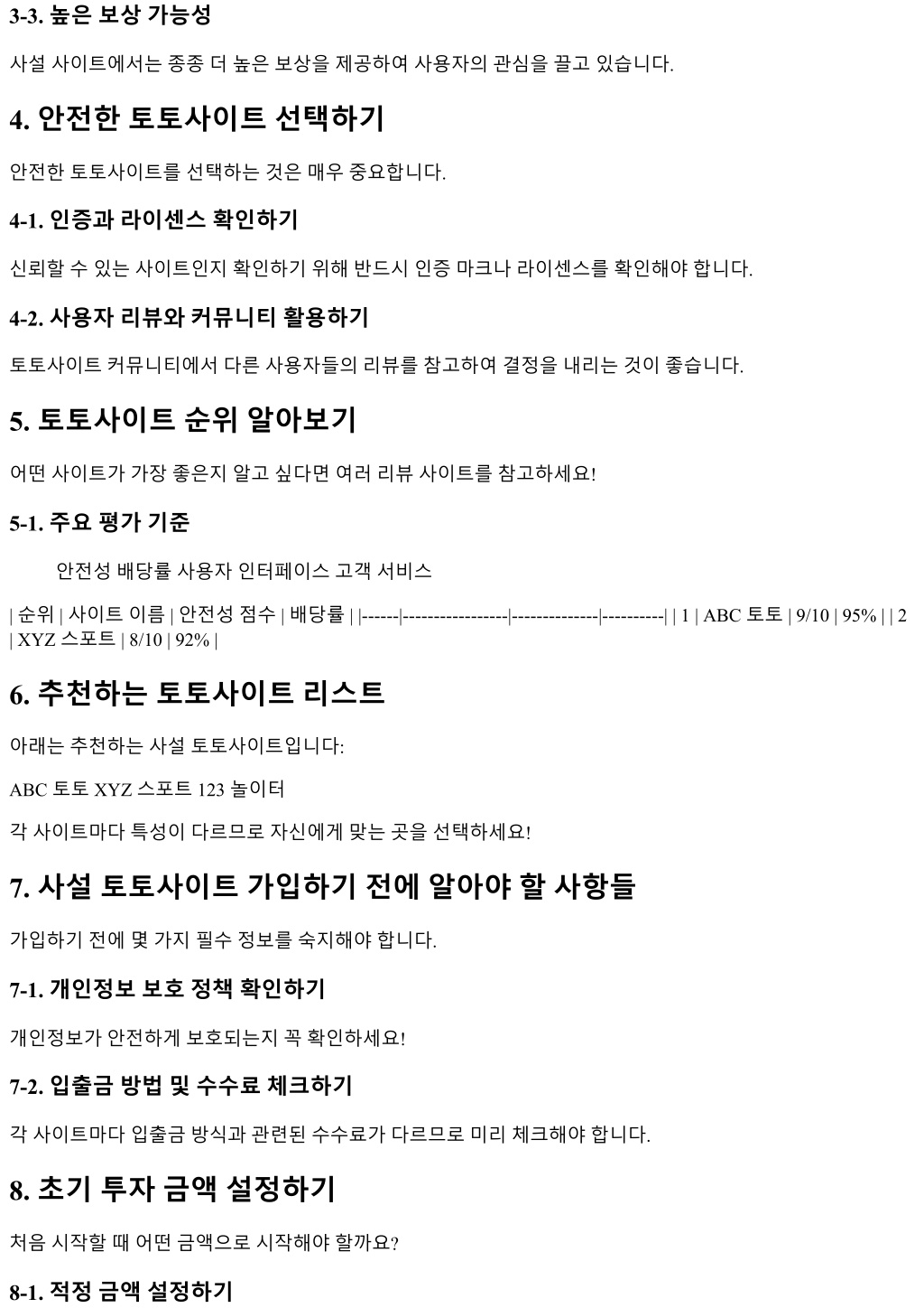 2. 3-3. 높은보상가능성 사설사이트에서는종종더높은보상을제공하여사용자의관심을끌고있습니다. 4. 안전한토토사이트선택하기 안전한토토사이트를선택하는것은매우중요합니다. 4-1. 인증과라이센스확인하기 신뢰할수있는사이트인지확인하기위해반드시인증마크나라이센스를확인해야합니다. 4-2. 사용자리뷰와커뮤니티활용하기 토토사이트커뮤니티에서다른사용자들의리뷰를참고하여결정을내리는것이좋습니다. 5. 토토사이트순위알아보기 어떤사이트가가장좋은지알고싶다면여러리뷰사이트를참고하세요! 5-1. 주요평가기준 안전성배당률사용자인터페이스고객서비스 | 순위 | 사이트이름 | 안전성점수 | 배당률 | |------|-----------------|--------------|----------| | 1 | ABC 토토 | 9/10 | 95% | | 2 | XYZ 스포트 | 8/10 | 92% | 6. 추천하는토토사이트리스트 아래는추천하는사설토토사이트입니다: ABC 토토 XYZ 스포트 123 놀이터 각사이트마다특성이다르므로자신에게맞는곳을선택하세요! 7. 사설토토사이트가입하기전에알아야할사항들 가입하기전에몇가지필수정보를숙지해야합니다. 7-1. 개인정보보호정책확인하기 개인정보가안전하게보호되는지꼭확인하세요! 7-2. 입출금방법및수수료체크하기 각사이트마다입출금방식과관련된수수료가다르므로미리체크해야합니다. 8. 초기투자금액설정하기 처음시작할때어떤금액으로시작해야할까요? 8-1. 적정금액설정하기