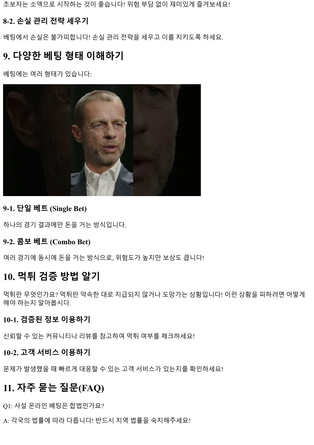 3. 초보자는소액으로시작하는것이좋습니다! 위험부담없이재미있게즐겨보세요! 8-2. 손실관리전략세우기 베팅에서손실은불가피합니다! 손실관리전략을세우고이를지키도록하세요. 9. 다양한베팅형태이해하기 베팅에는여러형태가있습니다: 9-1. 단일베트 (Single Bet) 하나의경기결과에만돈을거는방식입니다. 9-2. 콤보베트 (Combo Bet) 여러경기에동시에돈을거는방식으로, 위험도가높지만보상도큽니다! 10. 먹튀검증방법알기 먹튀란무엇인가요? 먹튀란약속한대로지급되지않거나도망가는상황입니다! 이런상황을피하려면어떻게 해야하는지알아봅시다. 10-1. 검증된정보이용하기 신뢰할수있는커뮤니티나리뷰를참고하여먹튀여부를체크하세요! 10-2. 고객서비스이용하기 문제가발생했을때빠르게대응할수있는고객서비스가있는지를확인하세요! 11. 자주묻는질문(FAQ) Q1: 사설온라인베팅은합법인가요? A: 각국의법률에따라다릅니다! 반드시지역법률을숙지해주세요!