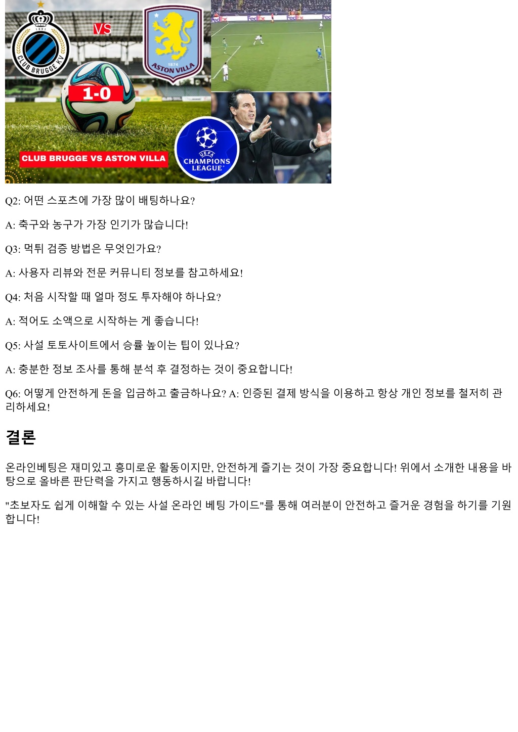 4. Q2: 어떤스포츠에가장많이배팅하나요? A: 축구와농구가가장인기가많습니다! Q3: 먹튀검증방법은무엇인가요? A: 사용자리뷰와전문커뮤니티정보를참고하세요! Q4: 처음시작할때얼마정도투자해야하나요? A: 적어도소액으로시작하는게좋습니다! Q5: 사설토토사이트에서승률높이는팁이있나요? A: 충분한정보조사를통해분석후결정하는것이중요합니다! Q6: 어떻게안전하게돈을입금하고출금하나요? A: 인증된결제방식을이용하고항상개인정보를철저히관 리하세요! 결론 온라인베팅은재미있고흥미로운활동이지만, 안전하게즐기는것이가장중요합니다! 위에서소개한내용을바 탕으로올바른판단력을가지고행동하시길바랍니다! "초보자도쉽게이해할수있는사설온라인베팅가이드"를통해여러분이안전하고즐거운경험을하기를기원 합니다!