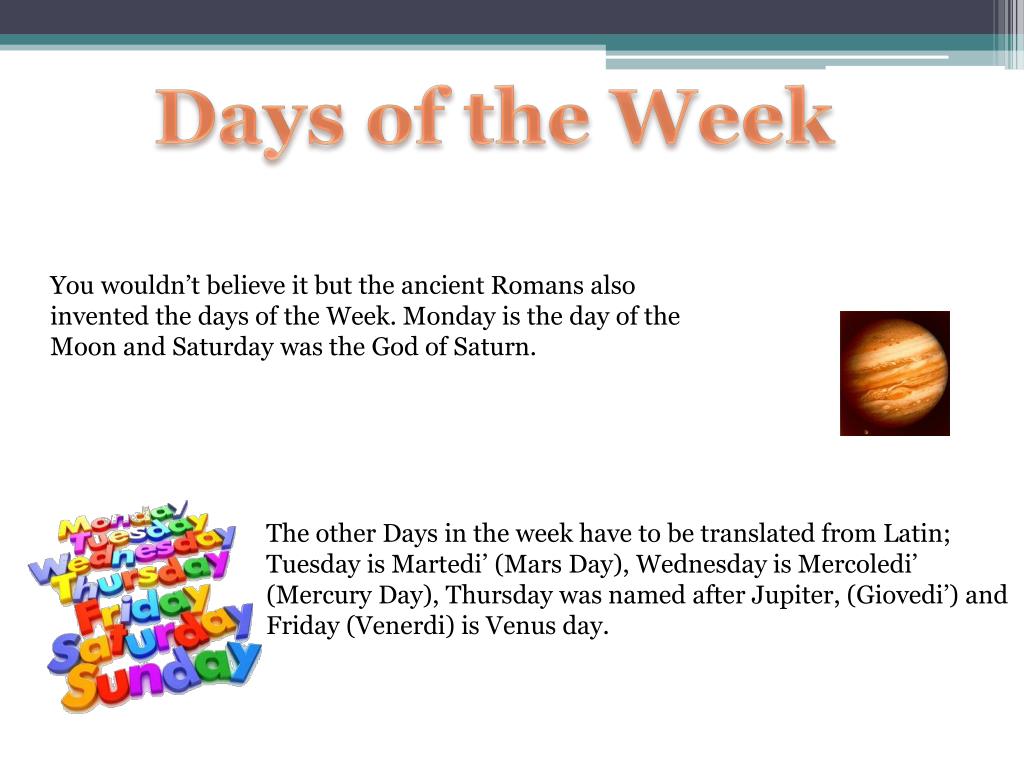 Days of the Week You wouldn’t believe it but the ancient Romans also invented the days of the Week. Monday is the day of the Moon and Saturday was the God of Saturn. The other Days in the week have to be translated from Latin; Tuesday is Martedi’ (Mars Day), Wednesday is Mercoledi’ (Mercury Day), Thursday was named after Jupiter, (Giovedi’) and Friday (Venerdi) is Venus day.