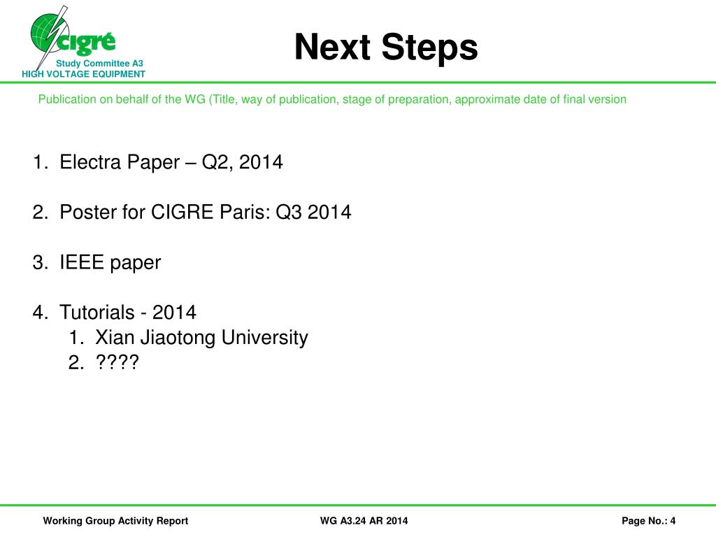 Publication on behalf of the WG (Title, way of publication, stage of preparation, approximate date of final version • Electra Paper – Q2, 2014 • Poster for CIGRE Paris: Q3 2014 • IEEE paper • Tutorials - 2014 • Xian JiaotongUniversity • ???? Next Steps WG A3.24 AR 2014
