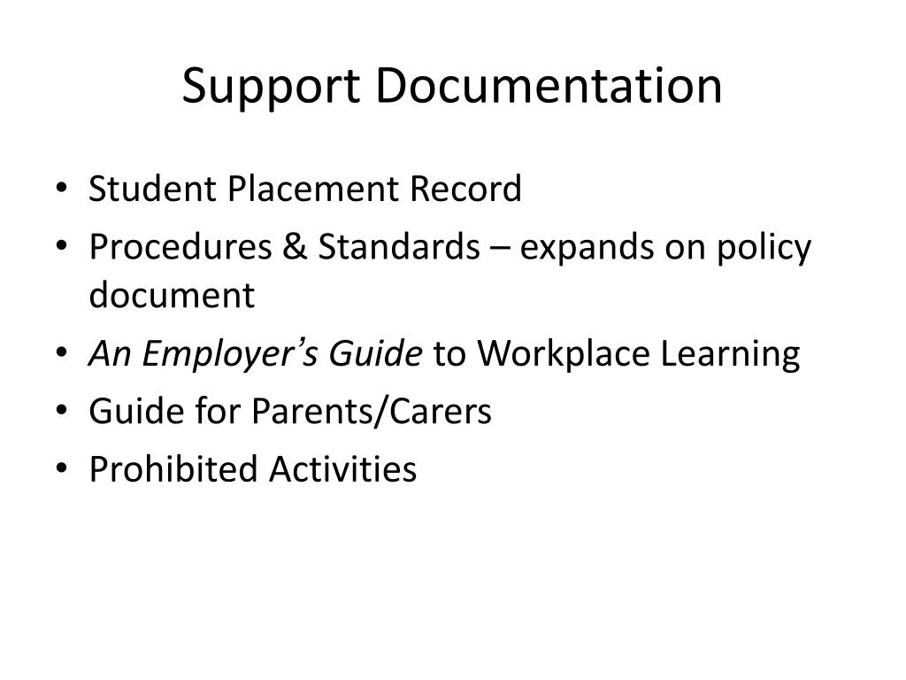 Support Documentation • Student Placement Record • Procedures & Standards – expands on policy document • An Employer’s Guide to Workplace Learning • Guide for Parents/Carers • Prohibited Activities