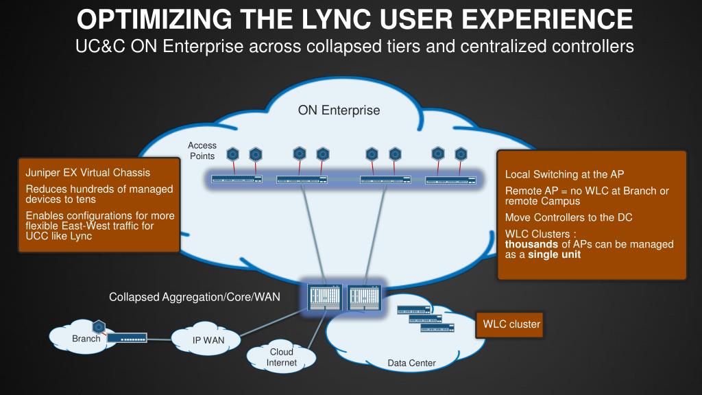 OPTIMIZING THE LYNC USER EXPERIENCE UC&C ON Enterprise across collapsed tiers and centralized controllers ON Enterprise Access Points Local Switching at the AP Remote AP = no WLC at Branch or remote Campus Move Controllers to the DC WLC Clusters :thousandsof APs can be managed as a single unit Juniper EX Virtual Chassis Reduces hundreds of manageddevices to tens Enables configurations for moreflexible East-West traffic for UCC like Lync ….. ….. Collapsed Aggregation/Core/WAN WLC cluster IP WAN Branch Data Center Cloud Internet