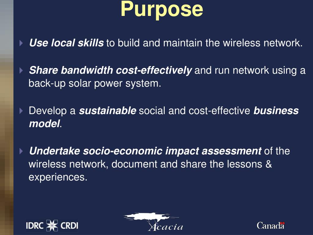Purpose • Use local skills to build and maintain the wireless network. • Share bandwidth cost-effectively and run network using a back-up solar power system. • Develop a sustainable social and cost-effective business model. • Undertake socio-economic impact assessment of the wireless network, document and share the lessons & experiences.