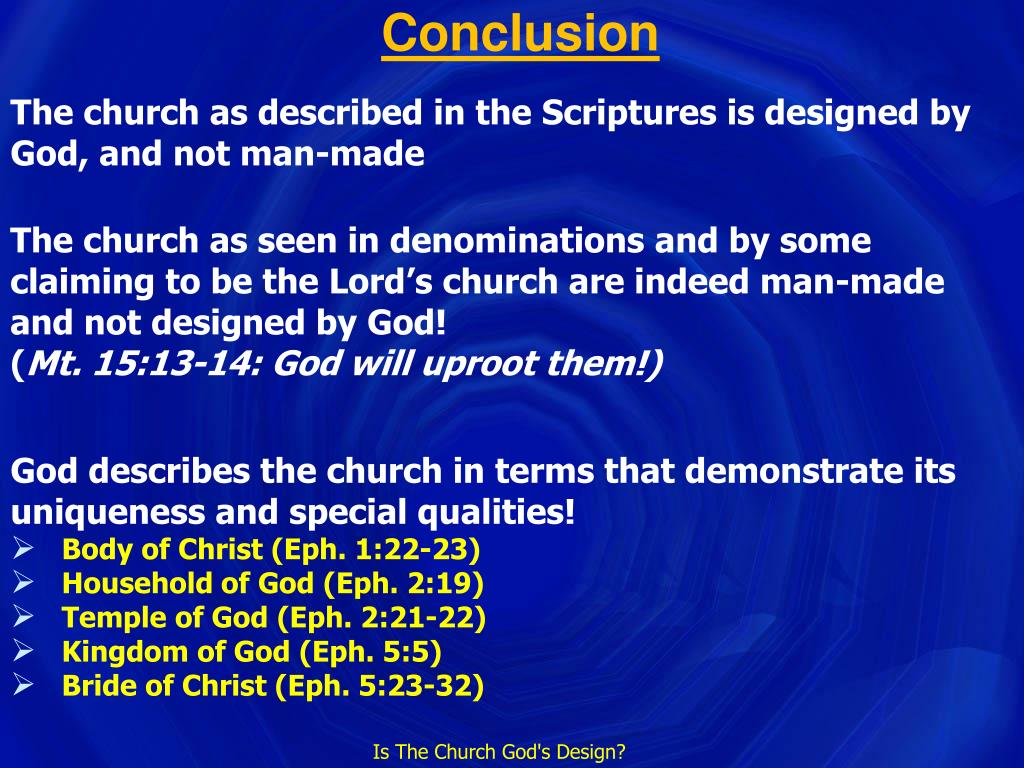 Intro Mt. 16:16-19 16. Simon Peter answered, "You are the Christ, the Son of the living God." 17. And Jesus said to him, "Blessed are you, Simon Barjona, because flesh and blood did not reveal this to you, but My Father who is in heaven. 18. "I also say to you that you are Peter, and upon this rock I will build My church; and the gates of Hades will not overpower it. 19. "I will give you the keys of the kingdom of heaven; and whatever you bind on earth shall have been bound in heaven, and whatever you loose on earth shall have been loosed in heaven." Mt. 15:13-14 13. But He answered and said, "Every plant which My heavenly Father did not plant shall be uprooted. 14. "Let them alone; they are blind guides of the blind. And if a blind man guides a blind man, both will fall into a pit." There will be churches that are not from God and they will be uprooted! How can one know if they are in the church designed by God or man-made & will be uprooted? Is The Church God's Design?