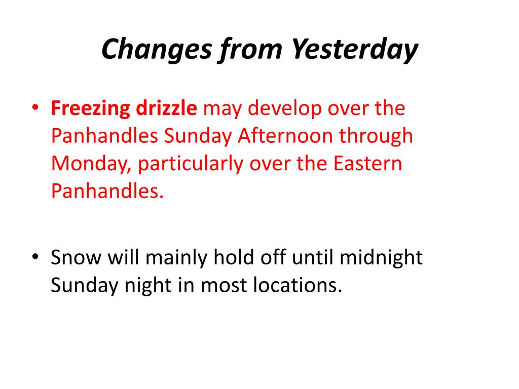 Changes from Yesterday • Freezing drizzle may develop over the Panhandles Sunday Afternoon through Monday, particularly over the Eastern Panhandles. • Snow will mainly hold off until midnight Sunday night in most locations.