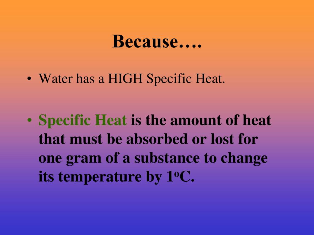 Because…. • Water has a HIGH Specific Heat. • Specific Heatis the amount of heat that must be absorbed or lost for one gram of a substance to change its temperature by 1oC.