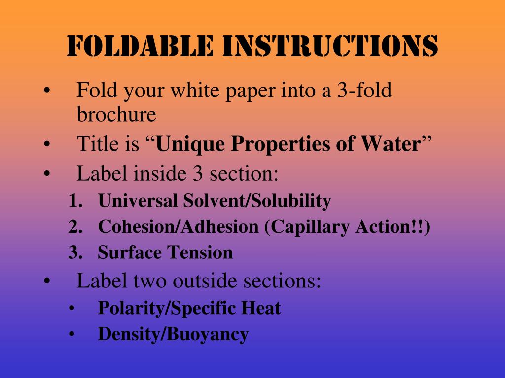 foldable Instructions • Fold your white paper into a 3-fold brochure • Title is “Unique Properties of Water” • Label inside 3 section: • Universal Solvent/Solubility • Cohesion/Adhesion (Capillary Action!!) • Surface Tension • Label two outside sections: • Polarity/Specific Heat • Density/Buoyancy