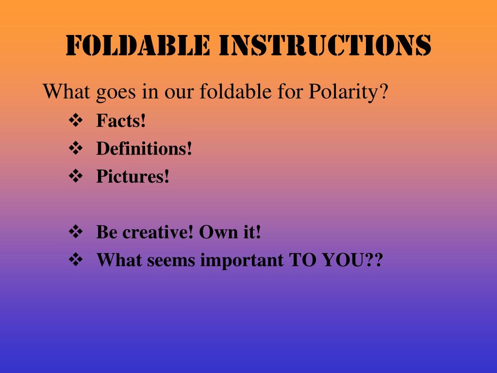 foldable Instructions What goes in our foldable for Polarity? • Facts! • Definitions! • Pictures! • Be creative! Own it! • What seems important TO YOU??