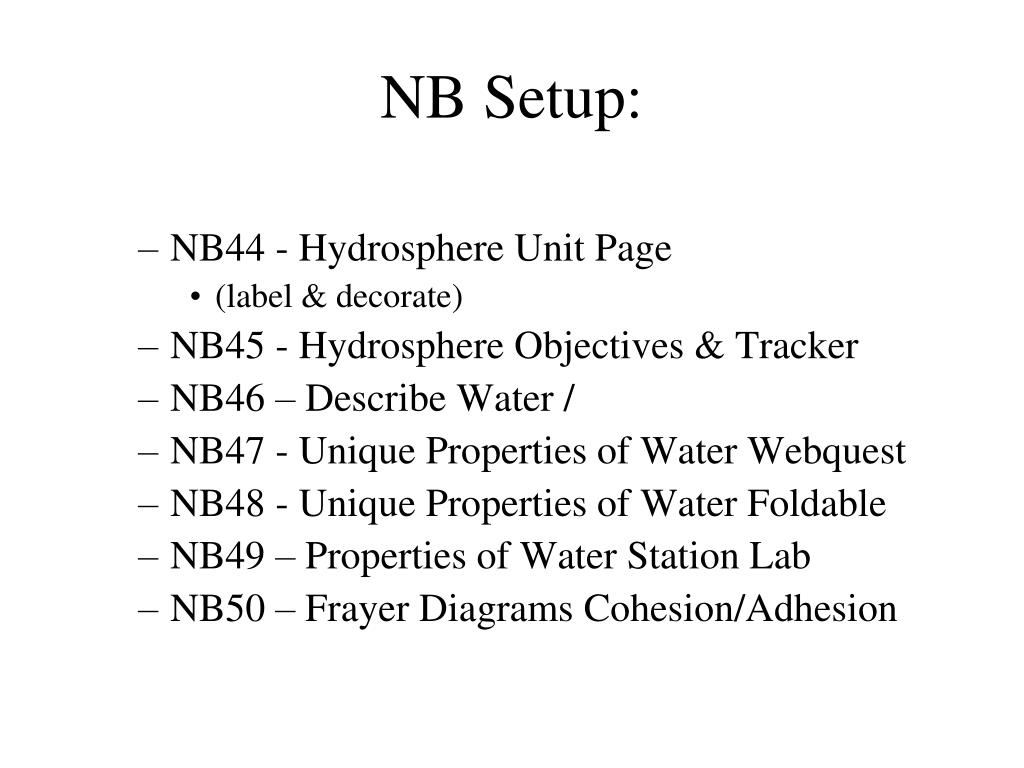NB Setup: • NB44 - Hydrosphere Unit Page • (label & decorate) • NB45 - Hydrosphere Objectives & Tracker • NB46 – Describe Water / • NB47 - Unique Properties of Water Webquest • NB48 - Unique Properties of Water Foldable • NB49 – Properties of Water Station Lab • NB50 – Frayer Diagrams Cohesion/Adhesion